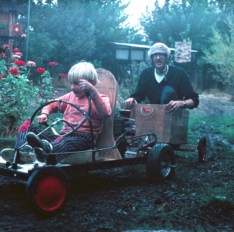 I’m not sure what started the whole go-kart thing, but for one of my birthdays they gave me an old lawnmower, with a Briggs & Stratton gas engine. The idea was to transplant the motor onto a go-kart frame we would soon fashion from an old steel army cot, with pneumatic hardware store wheels and bicycle sprockets for the drivetrain. The initial implementation had foot steering and no brakes, but version 2 was complete with a steering wishbone and direct linkage steering. And the backyard in Walnut Creek was mostly flat so who really needed brakes anyway?