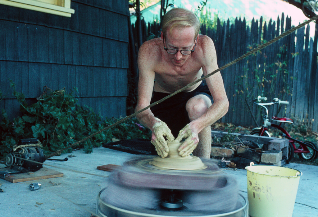 Yes, that’s an old washing machine motor and a rope driving the McGuyver’d potter’s wheel. If memory serves, it took a few iterations to get the speed right so the bricks (which made up the flywheel on the base) didn’t fly off and crush your toes.