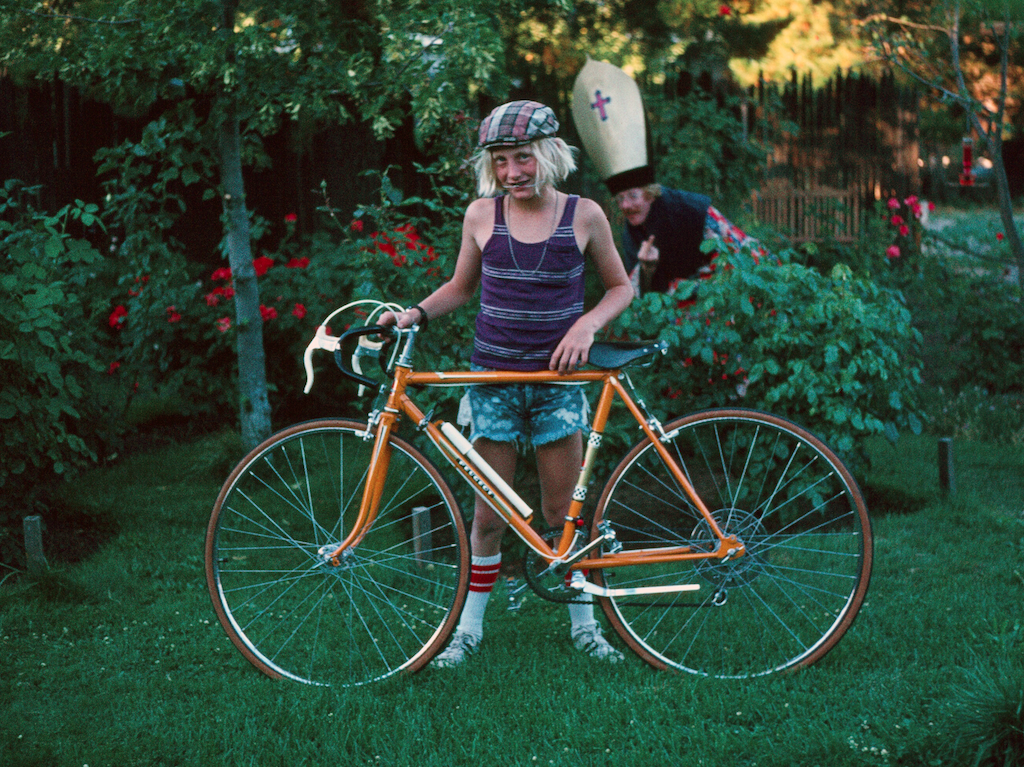 Here I am, proudly displaying my new 10-speed French road bike with him lurking in the roses, dressed as lord-knows-what and flipping off the camera. I’d be surprised if he was even wearing pants!